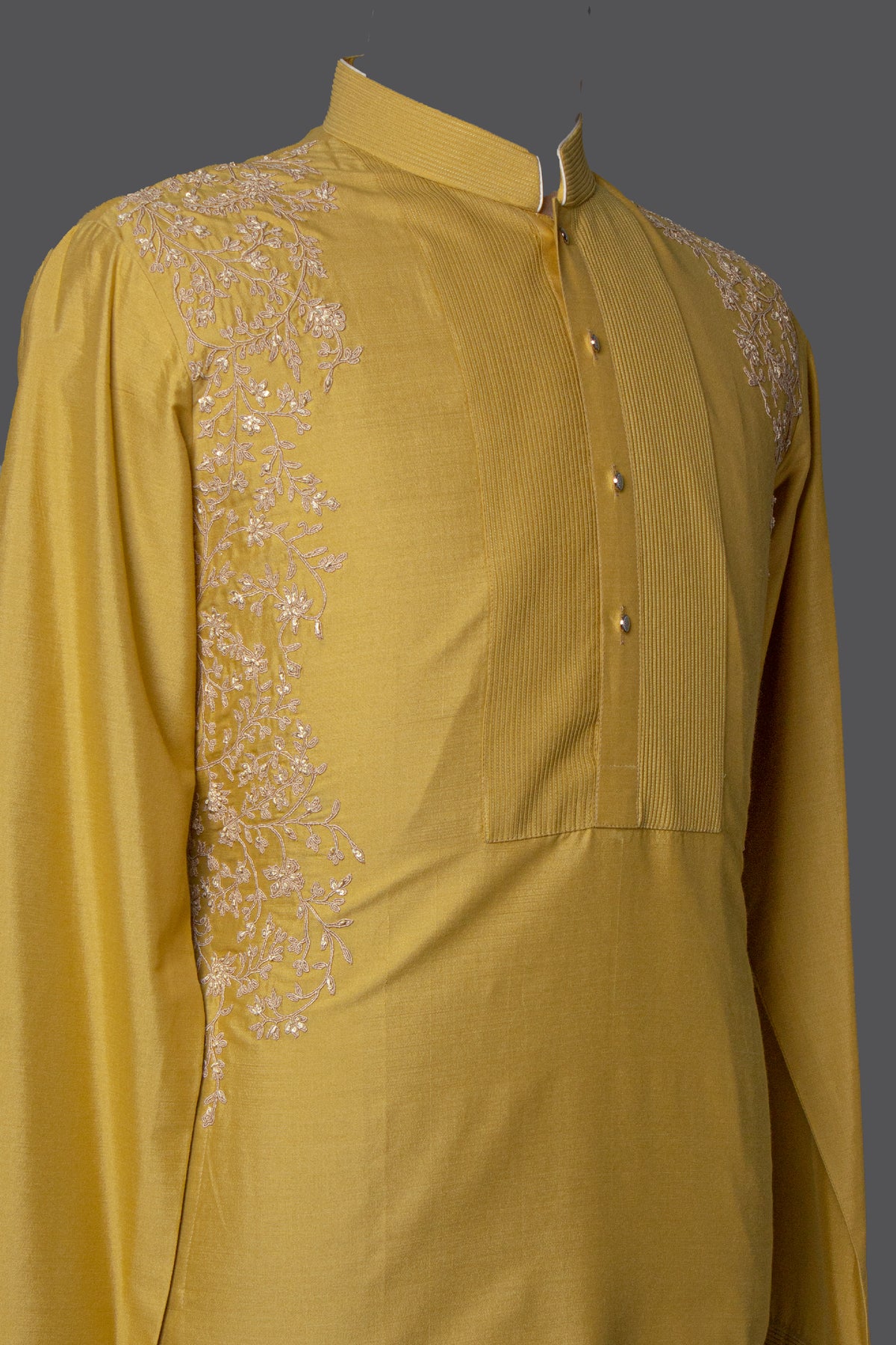 Bright, elegant, and thoughtfully detailed — this Lemon Yellow Kurta Set is crafted in soft and breathable Cotton Silk, making it a perfect choice for festive mornings, haldi functions, or day weddings. The kurta is adorned with a beautiful mix of pintuck, dori, and hand embroidery, creating a balanced blend of tradition and sophistication.