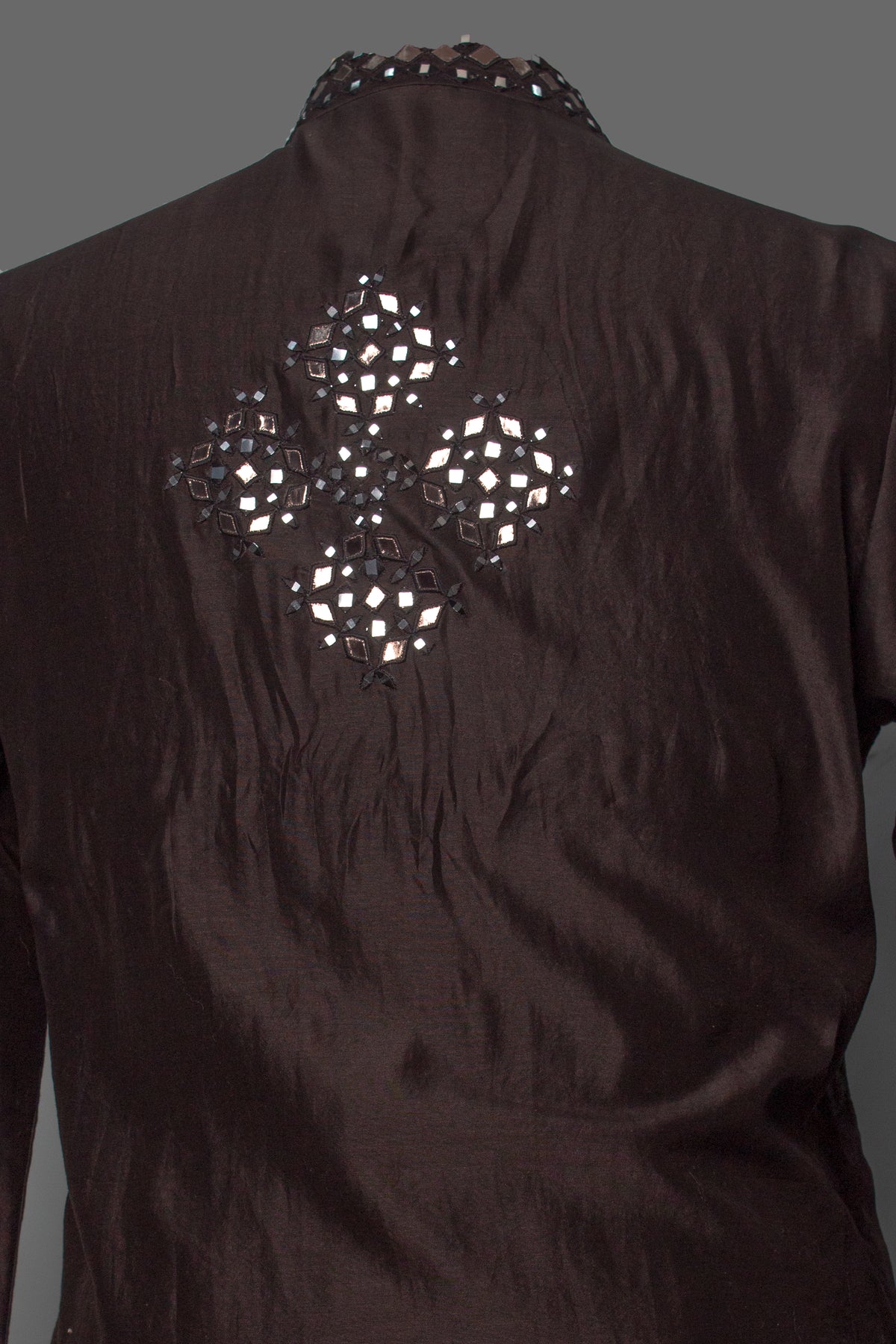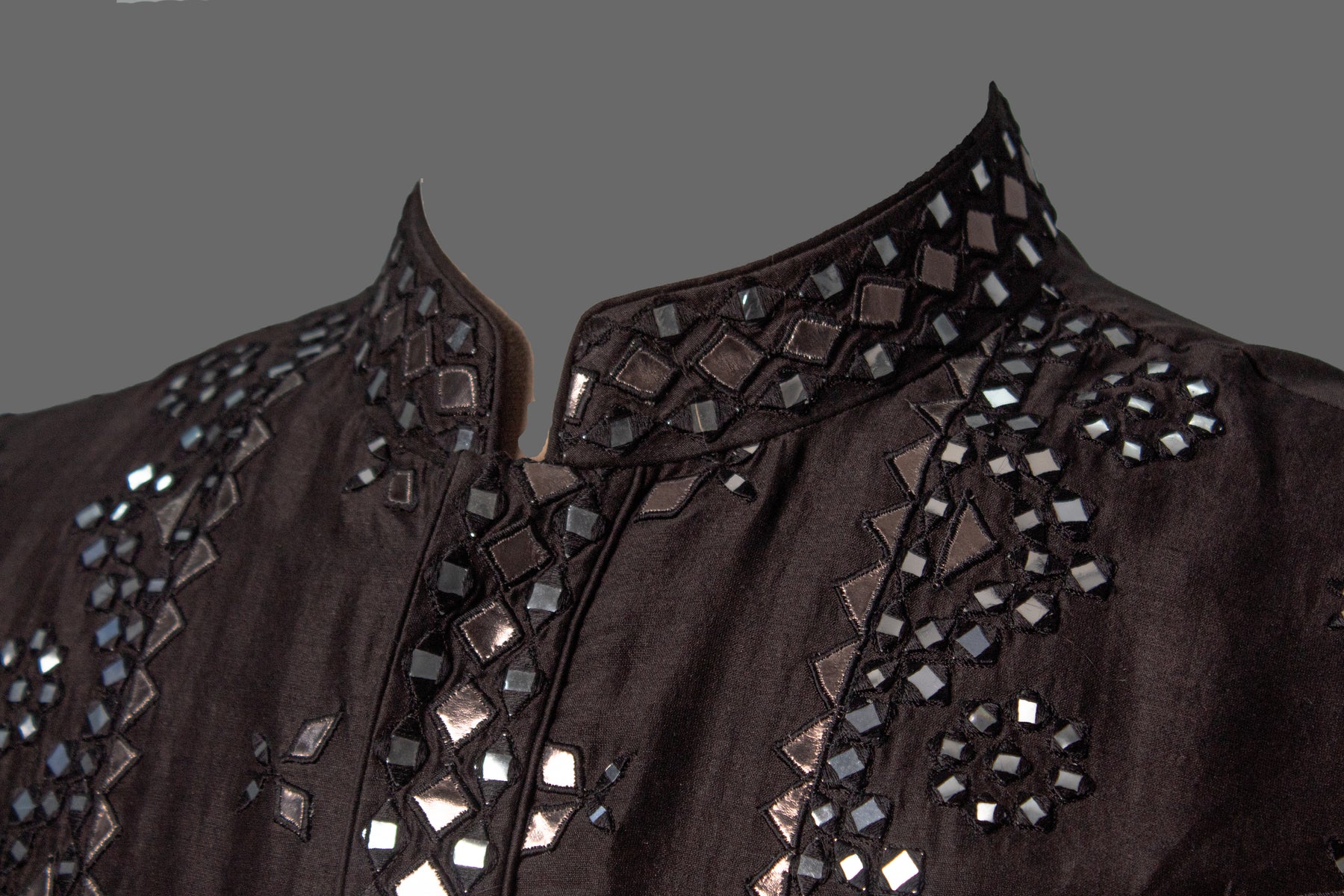 • Neckline: Enhanced with leather and mirror machine embroidery, giving it a sharp, refined finish