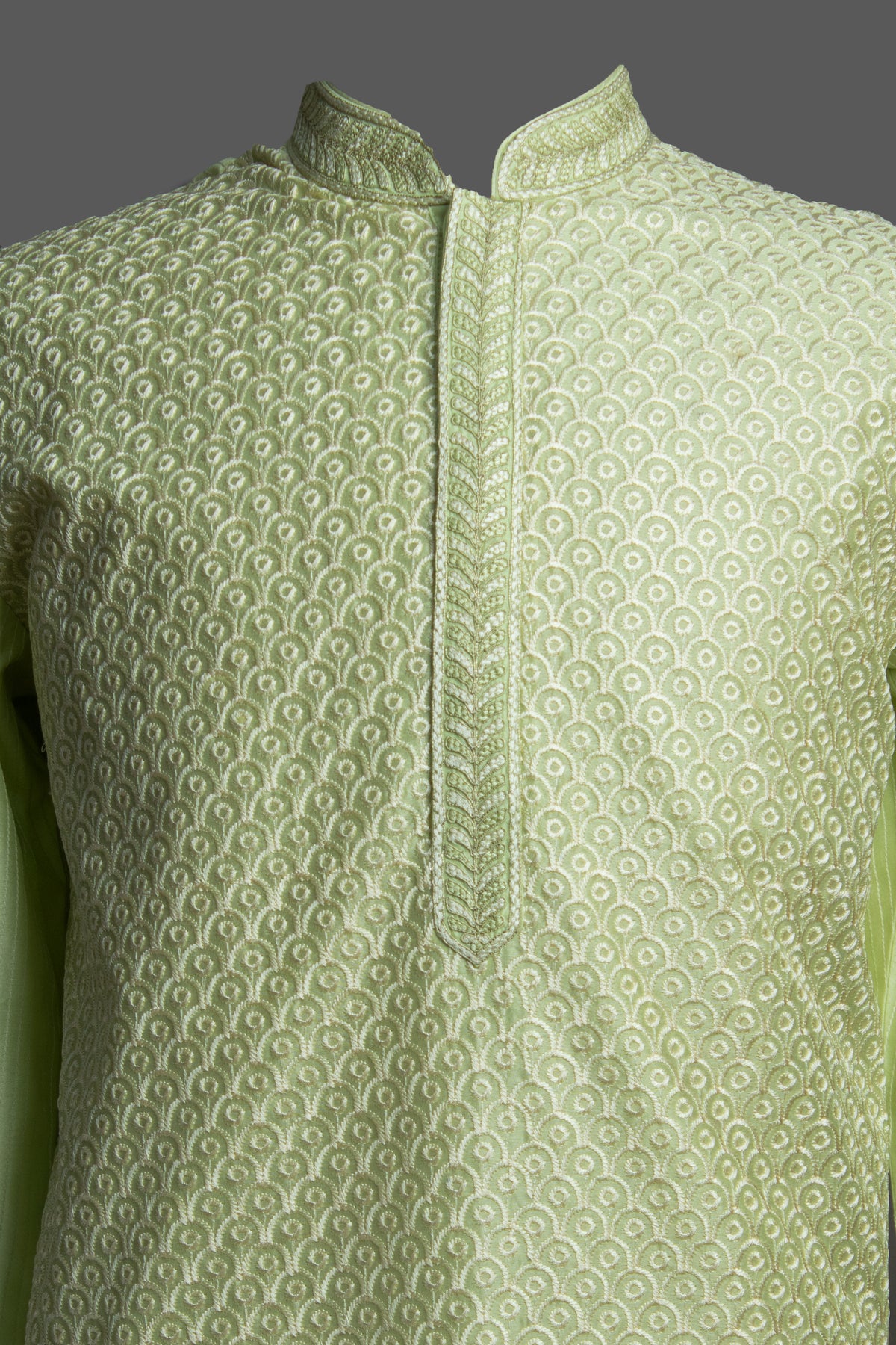 Bring freshness and elegance to your festive style with this Mint Green Chanderi Kurta Set, crafted for timeless sophistication. Made from lightweight and lustrous Chanderi fabric, the kurta features all-over machine embroidery on the front, giving it a rich and intricate appeal. The back is finished with neat stitch-line detailing, while the sleeves carry matching stitch-line accents for a clean and refined look. The neckline is highlighted with fine embroidery, adding a touch of grace to the ensemble.