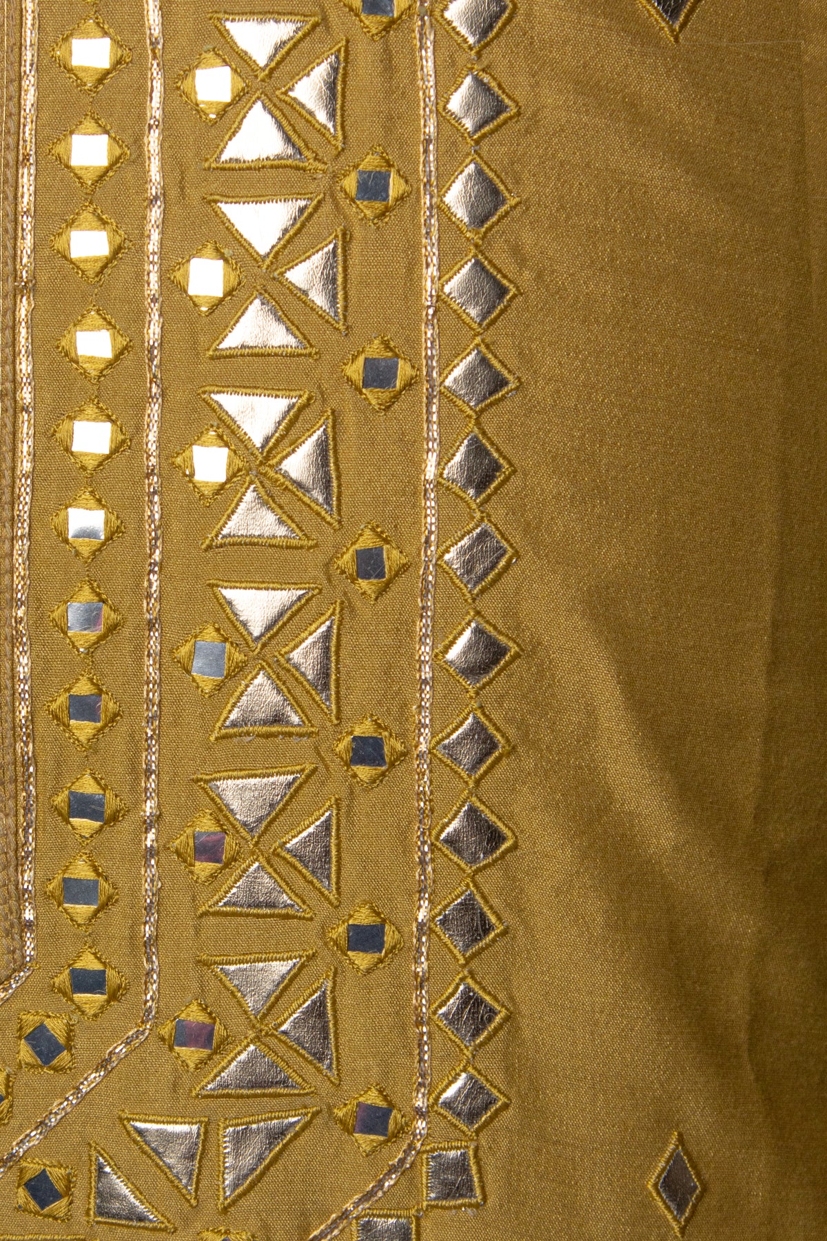 Neckline: Enhanced with machine-embroidered leather and mirror work, highlighting craftsmanship with a contemporary flair