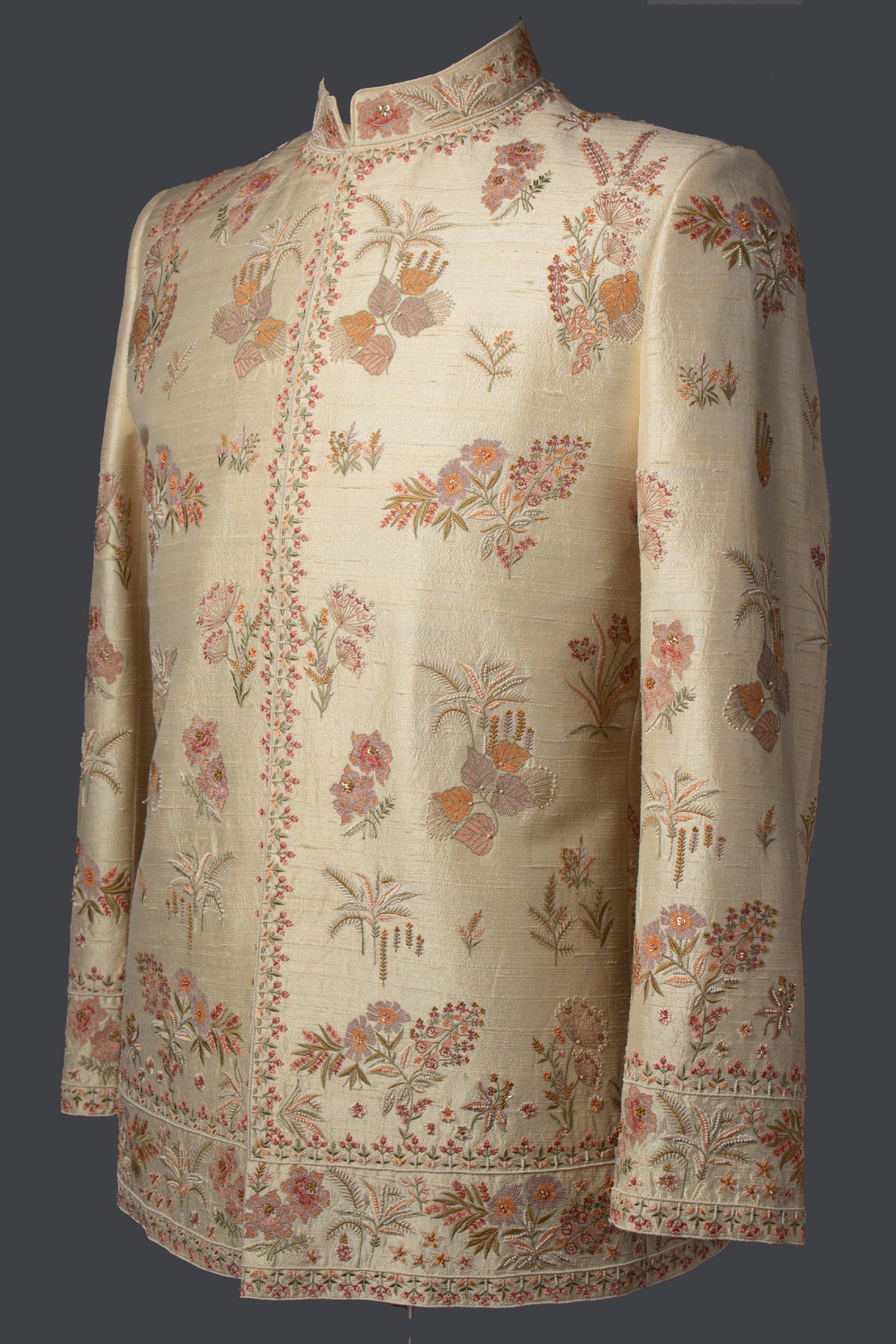 Cream Raw Silk Bandhgala Set with Hand & Machine Embroidery